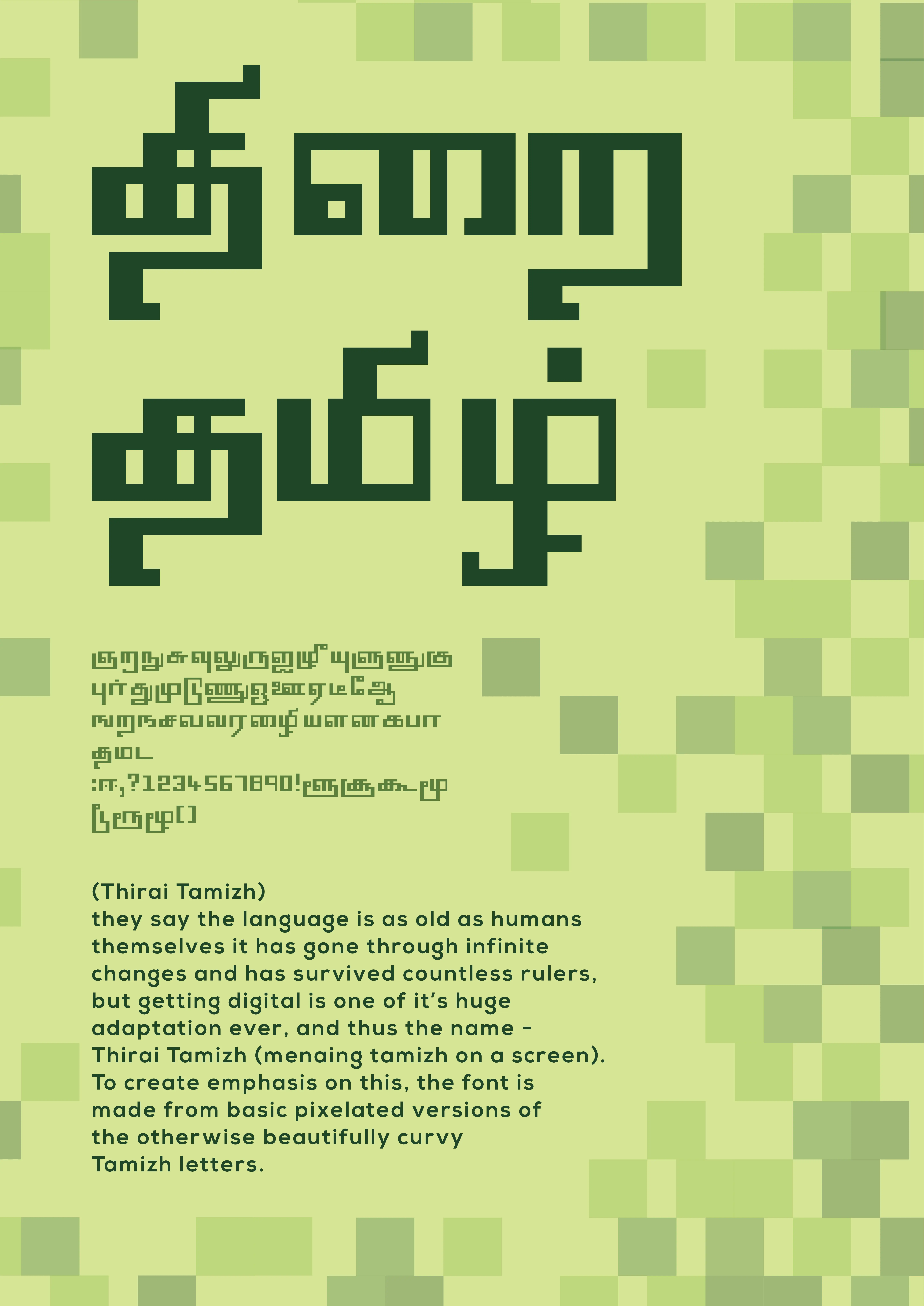 "Thirai Tamizh" is a pixelated font that translates the organic curves of the ancient Tamil script into a geometric, digital form, celebrating its adaptation for the modern screen.
